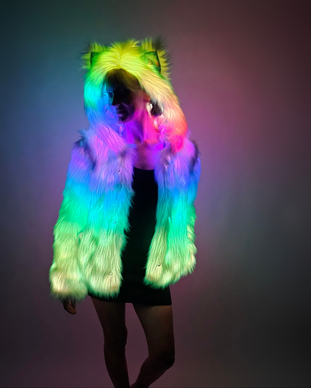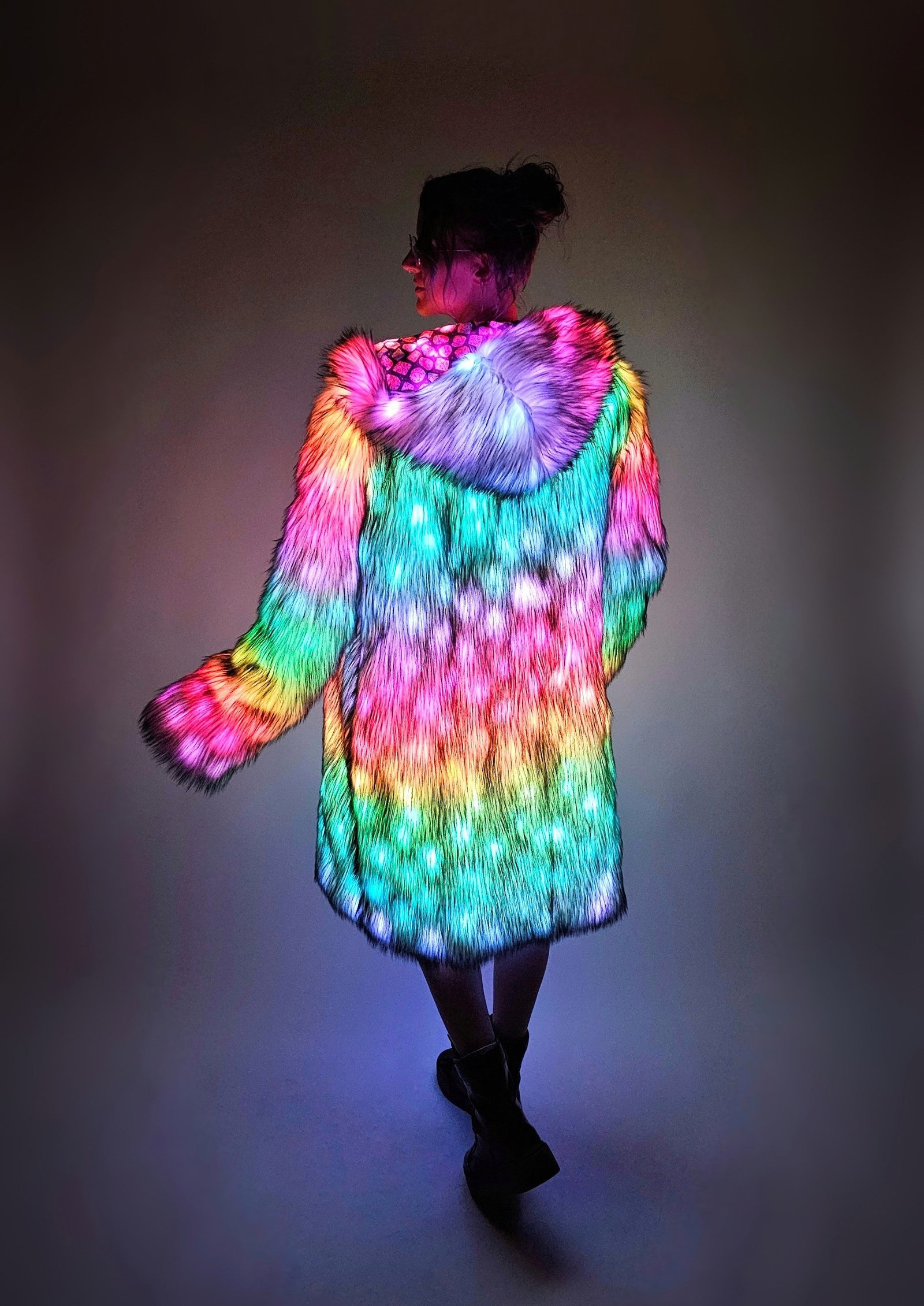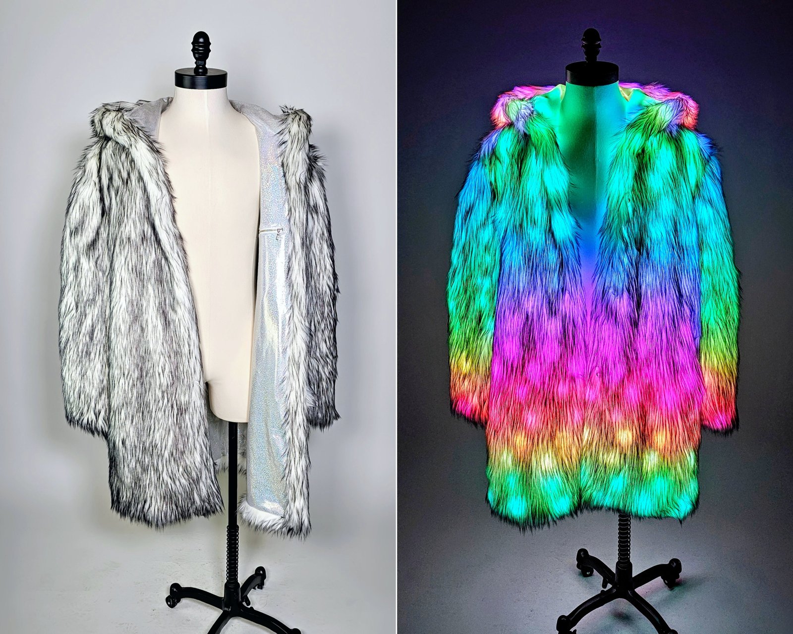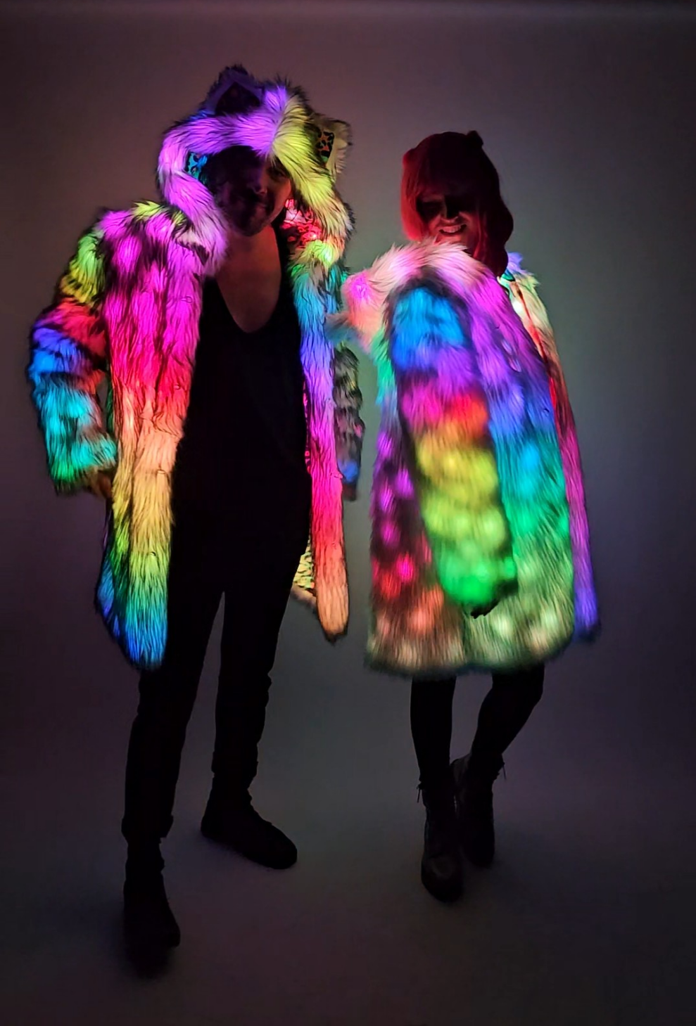 Ready to be the brightest thing at the festival besides the lasers? Our custom LED coats are handmade just for you – choose your faux fur, lining, and length, then light it up with all over LEDs for a one-of-a-kind creation that turns heads and sparks joy.