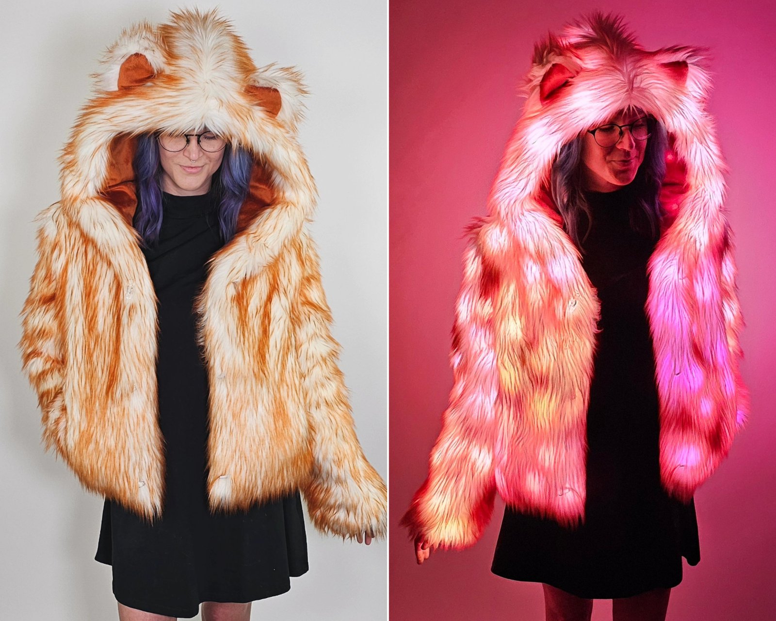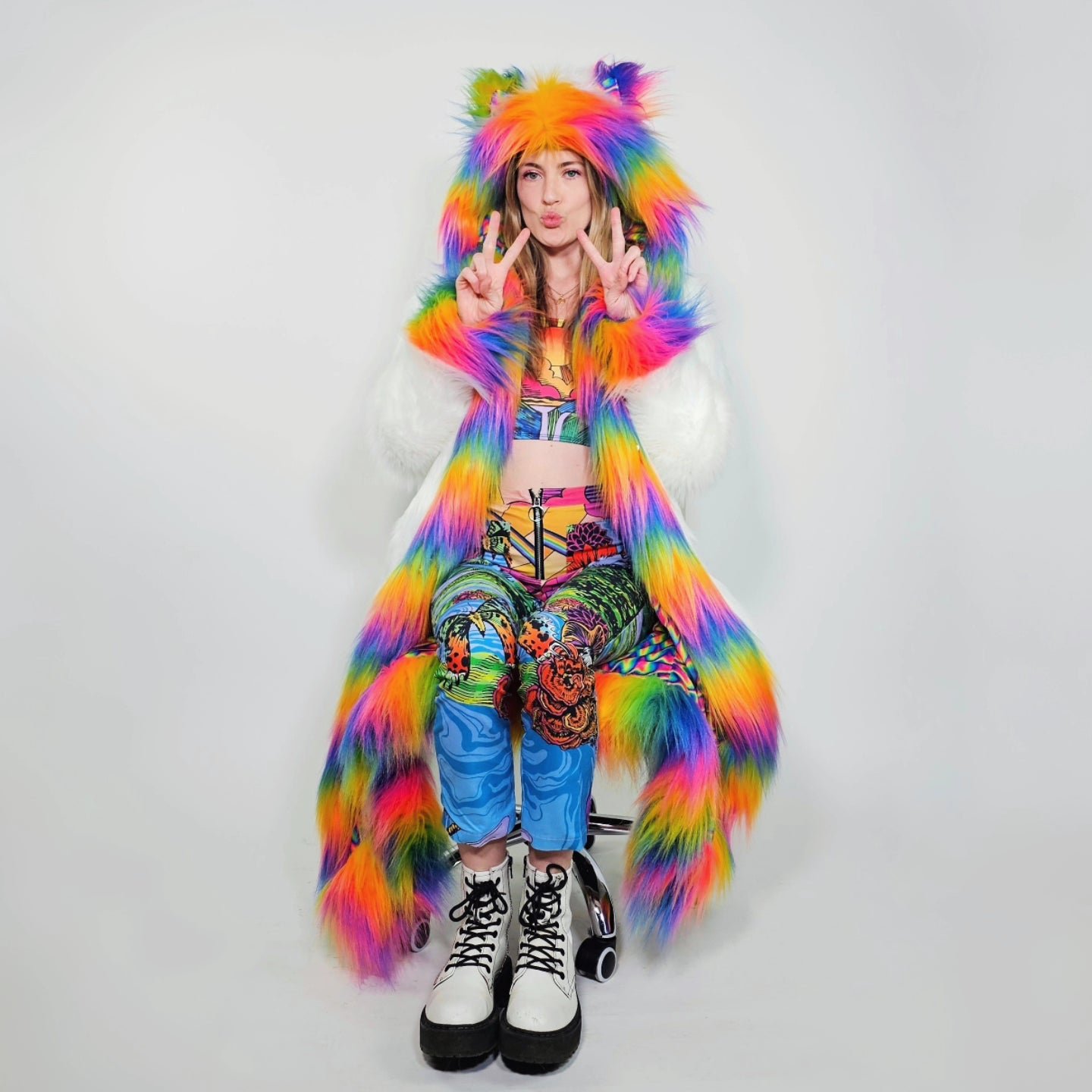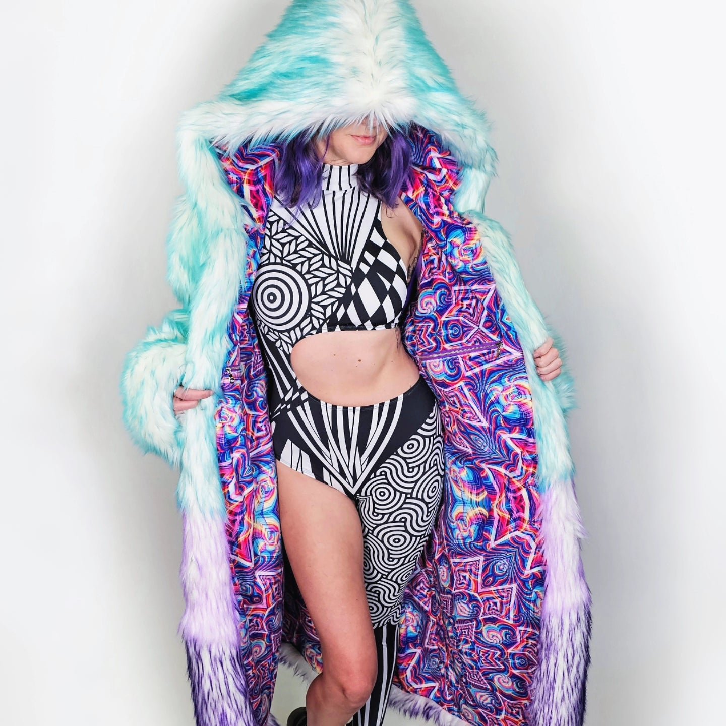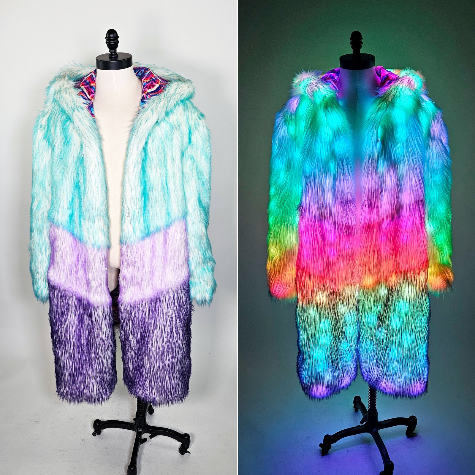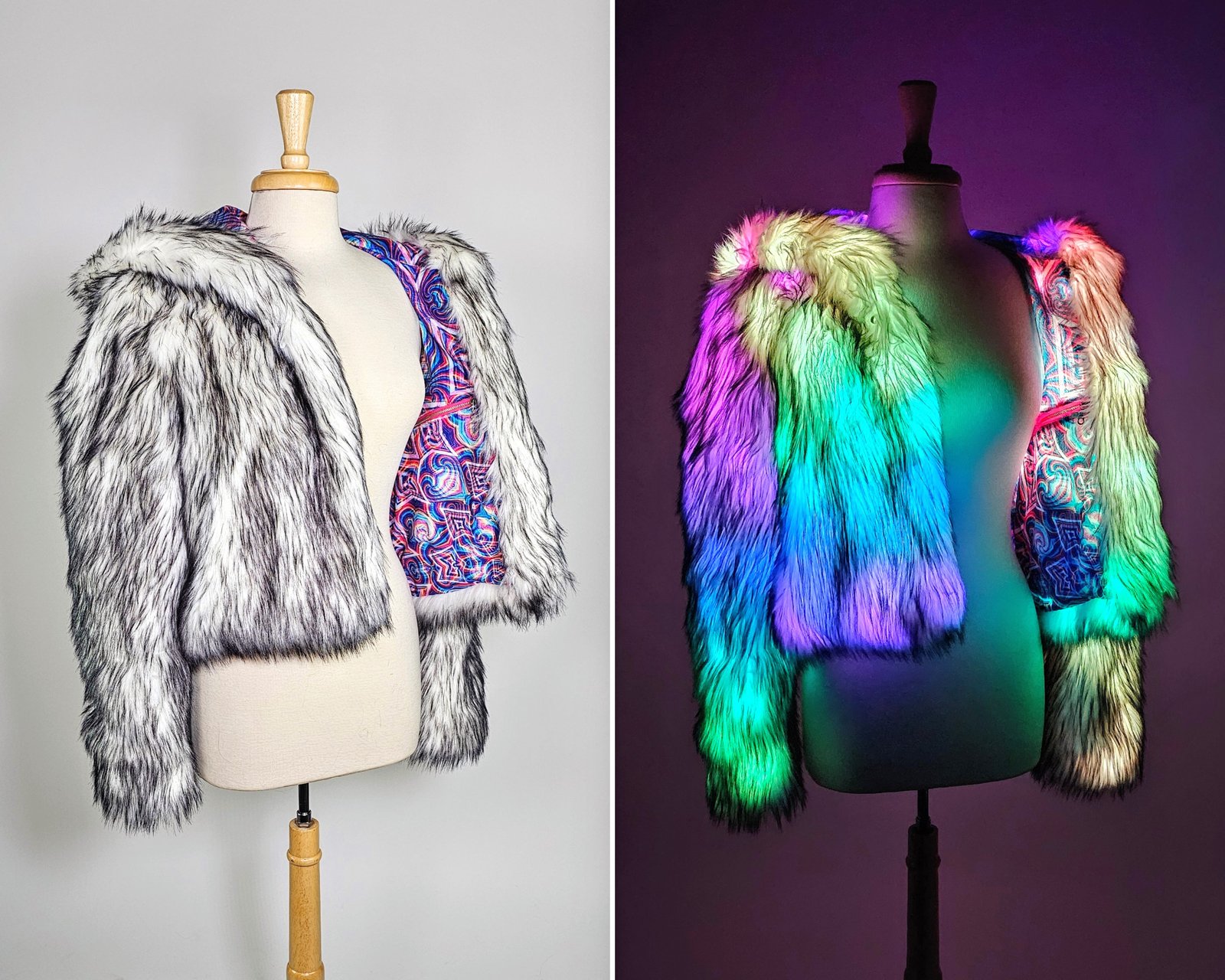 Ready to be the brightest thing at the festival besides the lasers? Our custom LED coats are handmade just for you – choose your faux fur, lining, and length, then light it up with all over LEDs for a one-of-a-kind creation that turns heads and sparks joy.