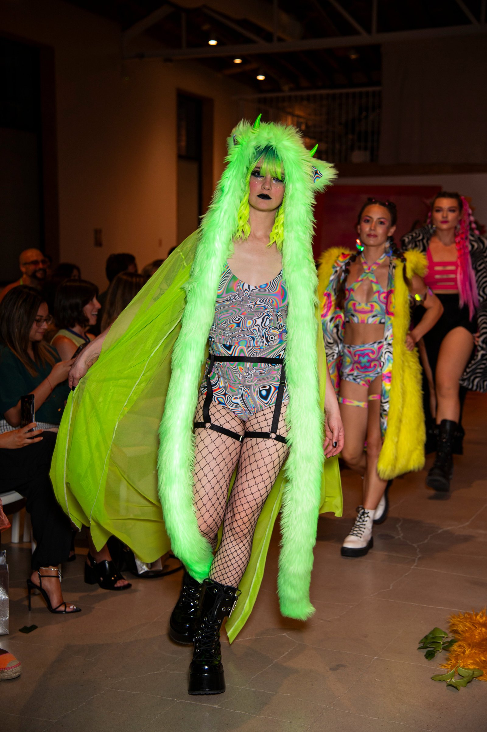 Made with UV-reactive green faux fur and lined in a funky psychedelic swirl fabric, this hood glows brilliantly under blacklight. The extra-long tentacles sway as you move, and the hood is topped with animal ears and custom 3D-printed horns – both UV reactive for an even brighter pop under the lights.